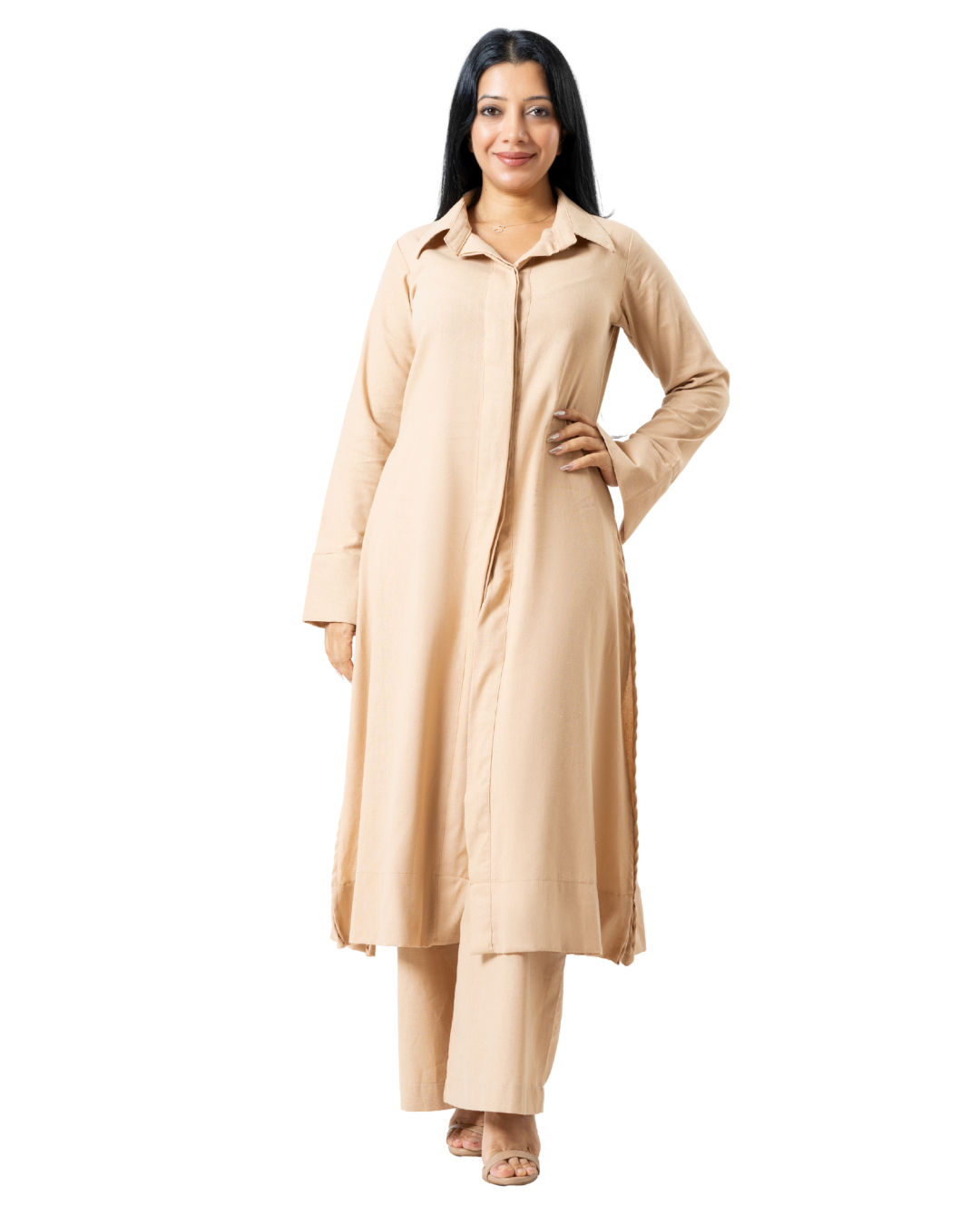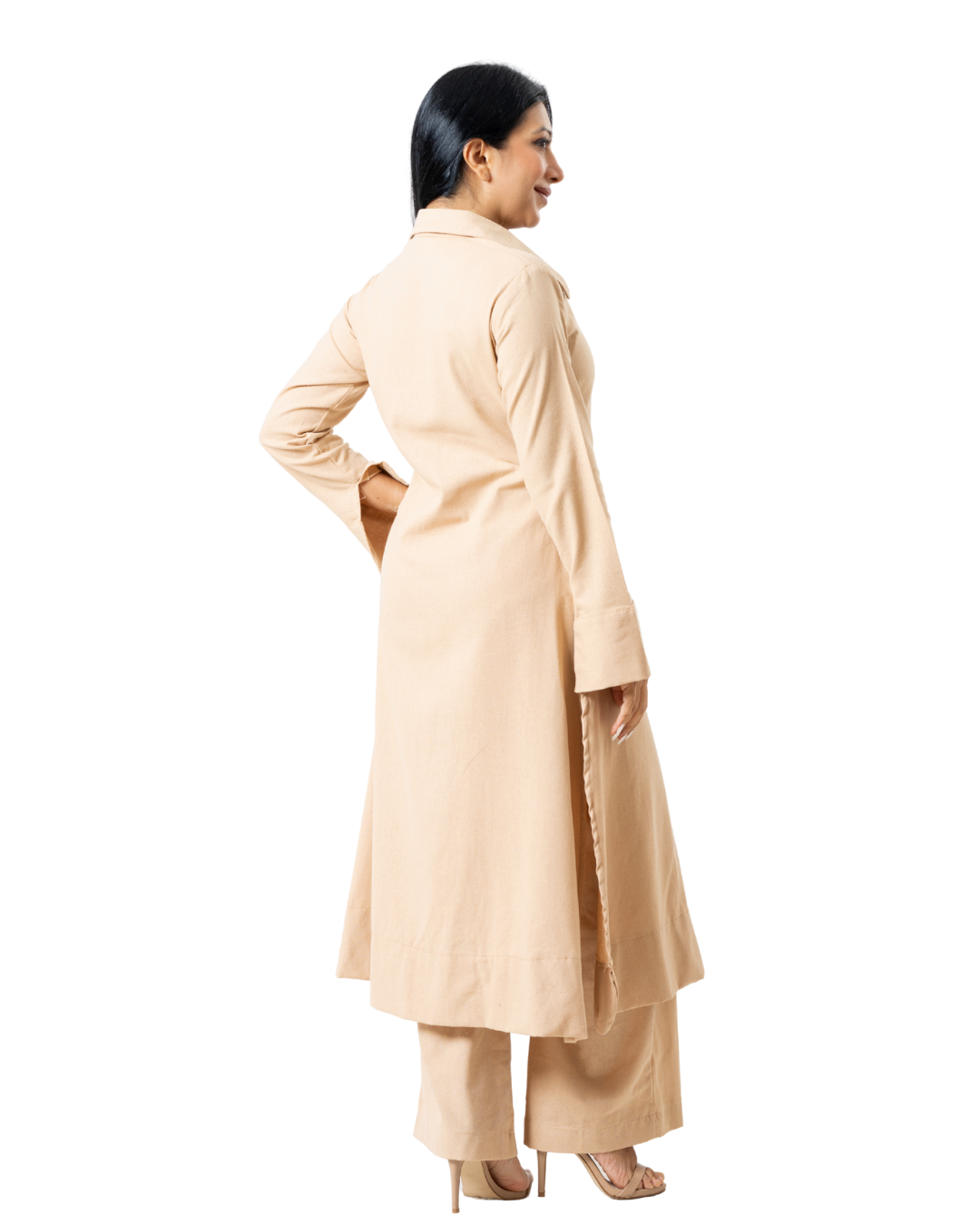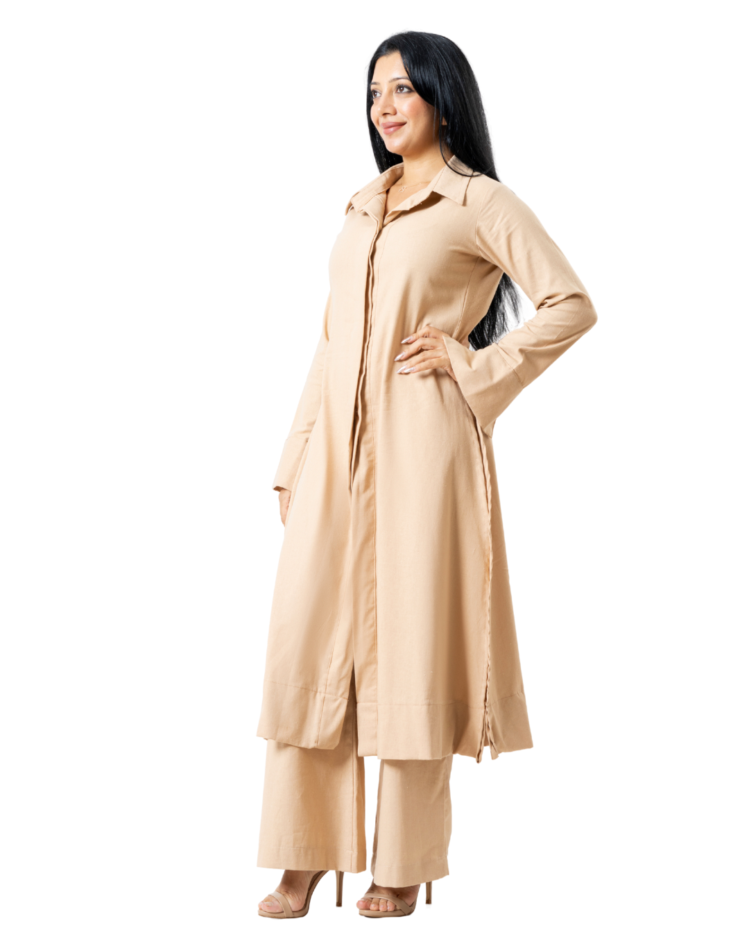 Beige Linen Kurtha - Long sleeves with wide legged pants available in all sizes