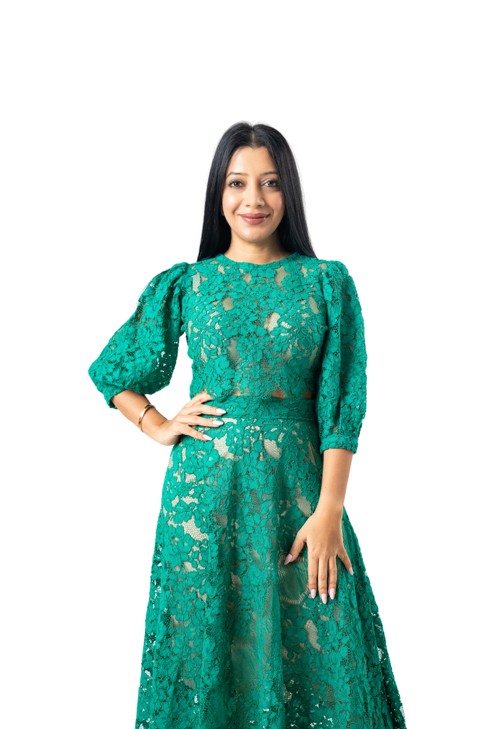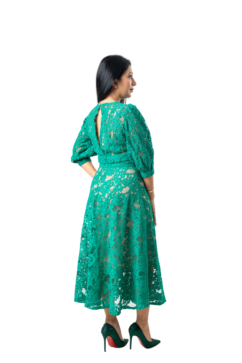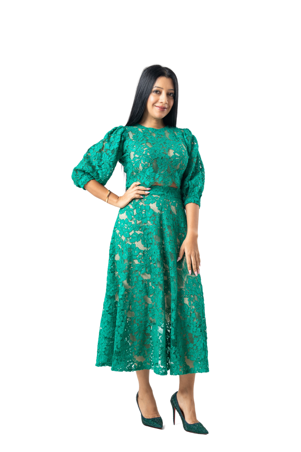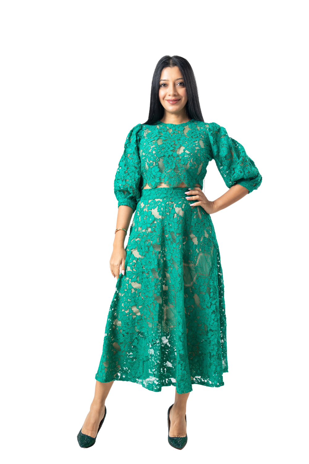 Green lace too and flared skirt
