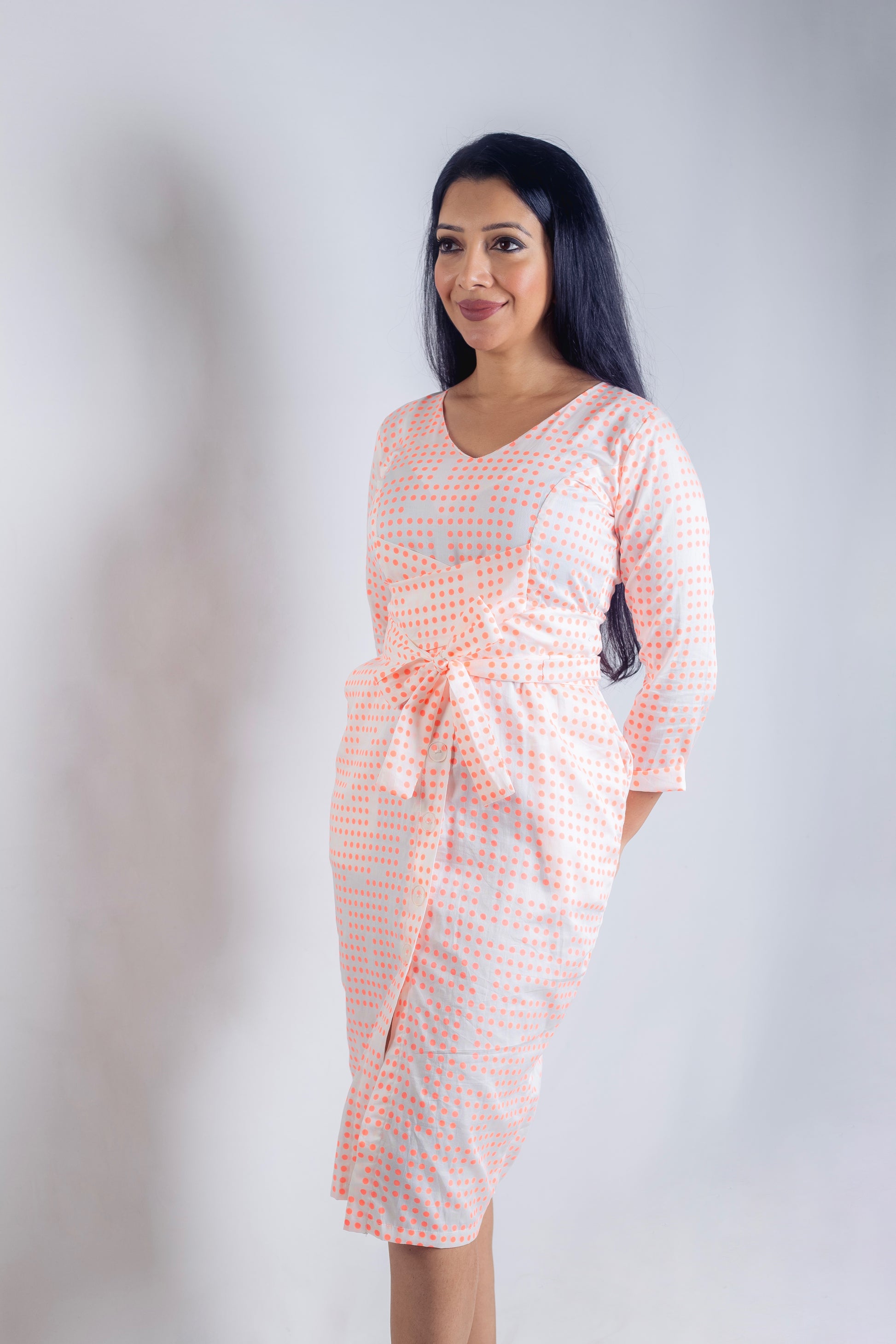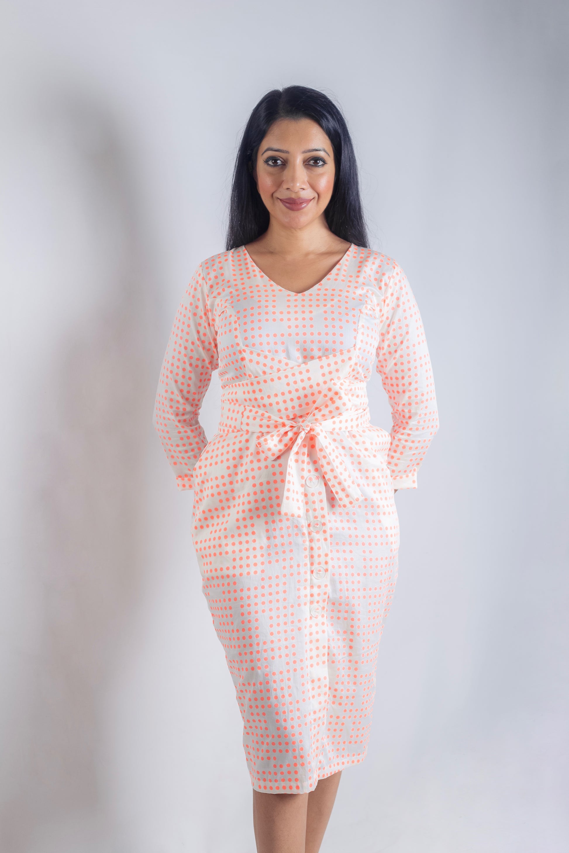 Long Sleeved fitted cotton Dress, with belt, made with 100% cotton fabric