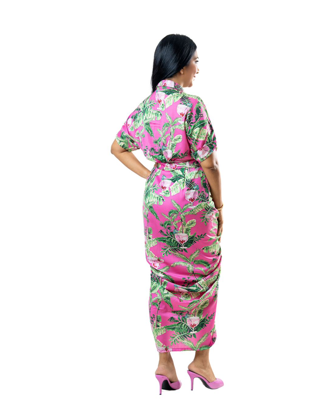 Tie up buttoned down dress with belt, Made with pink printed fabric